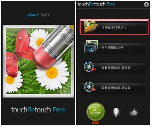 「TouchRetouch Free」即可輕鬆的抹去不想要的景物,程式執行會出現左圖的Logo畫面,稍待片刻即進入主畫面